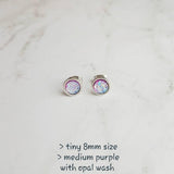 ¡Glam minimalista con metales mixtos de moda! ¡Pequeño, dulce y brilla como loco! Roca drusa/drusa de piedra sintética áspera y llena de baches en un hermoso color púrpura pálido lavado con ópalo. Toneladas de textura rugosa e interés en la forma tridimensional de la roca falsa. Los marcos y respaldos son de acero inoxidable hipoalergénico genuino. Maniquí lleva estos mismos aretes con un acabado diferente; se venden por separado.