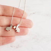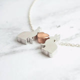 Bunny Love~ ♥ Mínimo y dulce como puede ser. Delicado collar de cadena fina con un corazón de latón bañado en oro rosa rodeado por dos conejitos de latón bañado en plata rodiada. Los conejitos y el corazón tienen un acabado de brillo mate suave {no un brillo de espejo muy pulido}. Los conejitos y el corazón están colgados por separado a lo largo de la cadena y se mueven independientemente uno del otro. Puedes optar por tener un corazón plateado que combine con los conejitos, para una apariencia más monocromática.