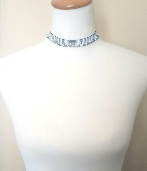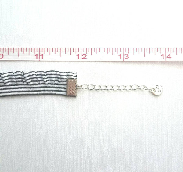 Collar estilo gargantilla/collar a rayas en blanco y negro elástico minimalista y sencillo con borde inferior con volantes. Volante mezcla de poliéster. ¡Funciona también como una querida pulsera envolvente! Los extremos, el dije, el cierre y la cadena de extensión están hechos de latón bañado en plata brillante.