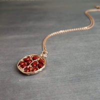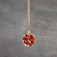Thick round rose gold finish half pomegranate pendant with beautiful little solid opaque maroon red glass "seeds". Pomegranates are a well-known symbol of abundance, fertility, and good luck. Backside of pendant is textured and solid color {see photos}. Last five photos show this necklace in antiqued silver with crimson red translucent "seeds". Sold separately in my shop.