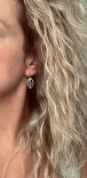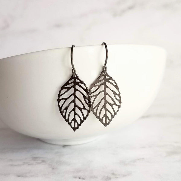Pequeñas hojas de filigrana con acabado de bronce de cañón {negro plateado brillante muy oscuro} en un moderno diseño recortado. Colgado simplemente en pequeños ganchos simples de bronce. Muy livianos y fáciles de usar, ¡como si ni siquiera estuvieran allí! Estos incluirán pequeños tapones de goma transparentes para un uso más seguro. Los hago en varios acabados {enlaces a continuación}.