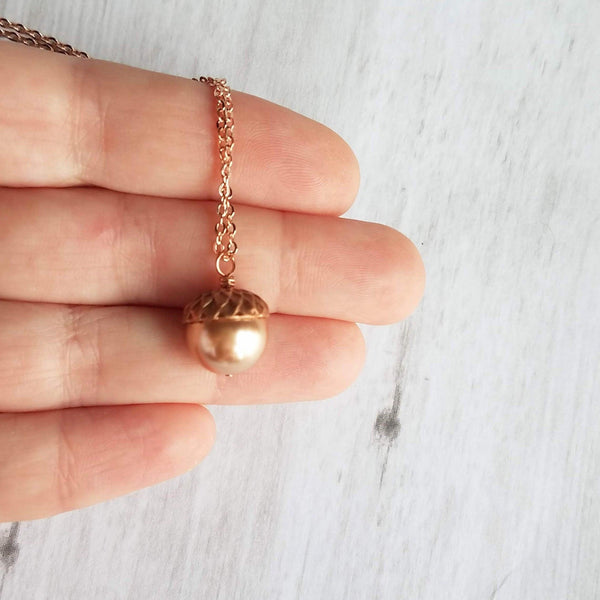 Una auténtica perla de oro rosa de Swarovski vestida al estilo bellota y rematada con una parte superior de color cobre rosado. La cadena es un pequeño y delicado eslabón ovalado con un cierre estilo langosta, ambos de latón chapado en oro rosa. La foto #5 {usada como referencia de tamaño} muestra este collar en un acabado de bronce/latón antiguo, se vende por separado en mi tienda.