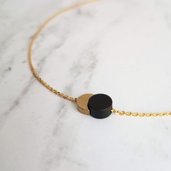 Pequeña media luna de latón macizo y encanto redondo de latón negro mate; se anidan juntos y también pueden moverse por separado a lo largo de la delicada y fina cadena de latón bañada en oro. Está disponible una actualización a una cadena de relleno de oro de 14 quilates.