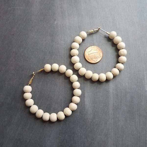 Estos aretes tienen aproximadamente 1,35 pulgadas {35 mm} de diámetro. Cada cuenta de madera tiene aproximadamente 0,27 de diámetro.