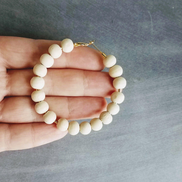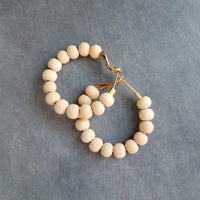 Pendientes pequeños de aro con cuentas de madera natural de color beige pálido. Cierre/cierre a presión. Muy ligero y cómodo. Pueden aparecer pequeñas marcas de madera natural en algunas cuentas, pero no son significativas y no restan belleza a los pendientes. Aros de latón bañados en oro.