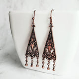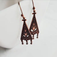 Antiqued {darkened in the crevices to highlight detail} rustic reddish-brown copper chandelier earrings with tiny matching dangling teardrops that also have a faint antiquing. Ornate flourish/swirling detail in a slightly raised design. The ear hooks are classic ball tip small hook style- also in an antique copper finish.